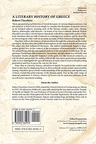 by Routledge; 1st edition (December 15, 2008) (Author) There are several good histories of Greek literature of various shapes and sizes, but the purpose of this book is not simply to consider the literature of ancient Greece as an isolated subject, treating each of the literary modes – epic, lyric, drama, history, philosophy, and rhetoric – in terms of its own evolution. Instead, Robert Flaceliere provides a Greek history that deals with all the important works of Hellenic literature that are still of interest to contemporary readers; and he does this in chronological order with an accurate account of their historical background.Flaceliere follows the history of Greece down through the centuries as the writer records it. He describes the political atmosphere in the nation and the advances in the other arts that influenced literature. The author understands Sappho’s rhapsodies; girlish love in the context of the acceptance of homosexuality in that era. He sympathizes with the unrequited passion of the penniless Archilochos. He appreciates Pindar’s pacifist tendencies, Herodotus’ upright insistence on truth, and Euripides’ doubts about the existence of the gods. For the classical centuries, so rich in talent and genius, the author follows the successive generations systematically so as to distinguish the special features of each, what it owes to the preceding generation and how it paves the way for the next.Since this is a literary history, attention is mainly focused on the writers and their works, but by displaying these in their political, social, artistic and scientific setting, Flaceliere gives a better understanding of the production and significance of these wonderful achievements of the human spirit. Due to the wide range of material presented, “A Literary History of Greece” can be used as a reference book as well as for enjoyment reading.