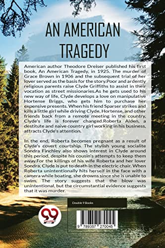 by Double 9 Booksllp (April 22, 2022) (Author) American author Theodore Dreiser published his first book, An American Tragedy, in 1925. The murder of Grace Brown in 1906 and the subsequent trial of her lover served as the basis for the story.Poor and ardently religious parents raise Clyde Griffiths to assist in their vocation as street missionaries.As he gets used to his new way of life, Clyde develops a love on manipulative Hortense Briggs, who gets him to purchase her expensive presents. When his friend Sparser strikes and kills a little girl while driving Clyde, Hortense, and other friends back from a remote meeting in the country, Clyde’s life is forever changed.Roberta Alden, a destitute and naive country girl working in his business, attracts Clyde’s attention. In the end, Roberta becomes pregnant as a result of Clyde’s covert courtship. The stylish young socialite Sondra Finchley also shows interest in Clyde around this period, despite his cousin’s attempts to keep them away.For the killings of his wife Roberta and her lover Sondra, Clyde is put to death in the electric chair. When Roberta unintentionally hits herself in the face with a camera while boating, she drowns since she is unable to swim. The story suggests that the blow was unintentional, but the circumstantial evidence suggests that it was murder.