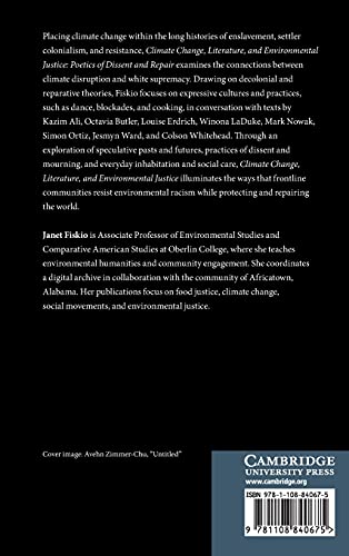 by Cambridge University Press (April 22, 2021) (Author) Placing climate change within the long histories of enslavement, settler colonialism, and resistance, Climate Change, Literature, and Environmental Justice: Poetics of Dissent and Repair examines the connections between climate disruption and white supremacy. Drawing on decolonial and reparative theories, Janet Fiskio focuses on expressive cultures and practices, such as dance, protests, and cooking, in conversation with texts by Kazim Ali, Octavia Butler, Louise Erdrich, Winona LaDuke, Mark Nowak, Simon Ortiz, Jesmyn Ward, and Colson Whitehead. Through an exploration of speculative pasts and futures, practices of dissent and mourning, and everyday inhabitation and social care, Climate Change, Literature, and Environmental Justice illuminates the ways that frontline communities resist environmental racism while protecting and repairing the world.