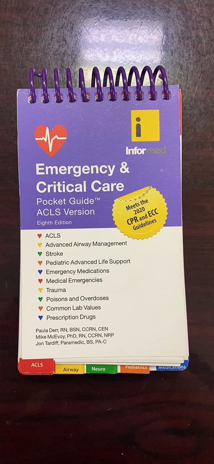This is the most popular pocket reference in emergency nursing. The Emergency & Critical Care Pocket Guide has been an essential resource for physicians, paramedics, and nurses for over a decade. The Pocket Guide consolidates critical information found in desk references into a convenient 3″x5″ pocket-size format that is handy enough to take with you anywhere. The Revised Eighth Edition features: • Updated to align with the 2020 CPR and ECC Guidelines • Updated information on poisons and emergency medications • New ECG rhythm strips • Common drugs sections • Updated pediatric medications • Revised Spanish section • Straightforward medical emergency treatments