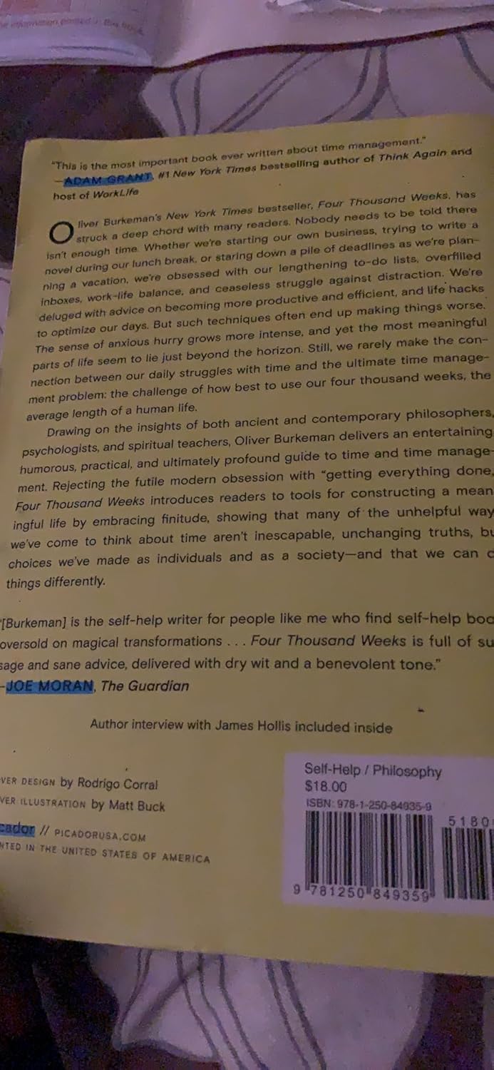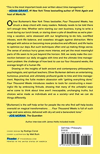Drawing on the insights of both ancient and contemporary philosophers, psychologists, and spiritual teachers, Oliver Burkeman delivers an entertaining, humorous, practical, and ultimately profound guide to time and time management. Rejecting the futile modern obsession with “getting everything done,” Four Thousand Weeks introduces readers to tools for constructing a meaningful life by embracing finitude, showing that many of the unhelpful ways we’ve come to think about time aren’t inescapable, unchanging truths, but choices we’ve made as individuals and as a society―and that we can do things differently.