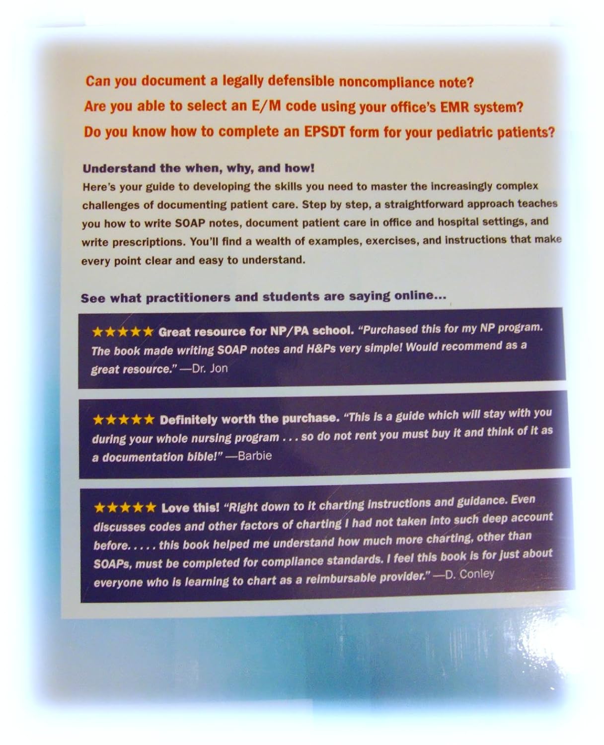 Love this! “Right down to it charting instructions and guidance. Even discusses codes and other factors of charting I had not taken into such deep account before. … this book helped me understand how much more charting, other than SOAP’s, must be completed for compliance standards. I feel this book is for just about everyone who is learning to chart as a reimbursable provider. —D. Conley