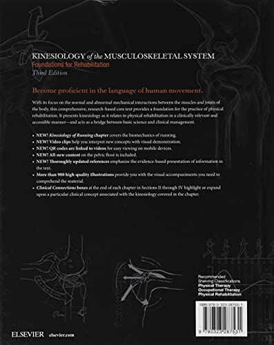 by Mosby; 3rd edition (November 11, 2016) (Author)With its focus on the normal and abnormal mechanical interactions between the muscles and joints of the body, Kinesiology of the Musculoskeletal System: Foundations for Rehabilitation, 3rd Edition provides a foundation for the practice of physical rehabilitation. This comprehensive, research-based core text presents kinesiology as it relates to physical rehabilitation in a clinically relevant and accessible manner. It provides students and clinicians with the language of human movement ― and acts as a bridge between basic science and clinical management. Full-color anatomic and kinesiologic illustrations clearly demonstrate the anatomy, functional movement, and biomechanical principles underlying movement; and dynamic new video clips help you interpret new concepts with visual demonstration.