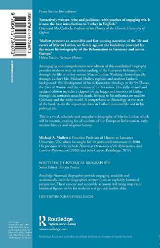 by Routledge; 2nd edition (August 26, 2014) (Author)An engaging and comprehensive new edition of this established biography provides students with an understanding of the European Reformation through the life of its key mover, Martin Luther. Working chronologically through Luther’s life, Michael A. Mullet explains and analyses Luther’s background, the development of his Reformation theology in the 95 Theses, the Diet of Worms and the creation of Lutheranism. This fully revised and updated new edition includes a chapter on the legacy and memory of Luther through the centuries since his death, looking to his influence on modern Germany and the wider world. A comprehensive chronology at the start of the book traces the important dates in Luther’s personal and political life.
