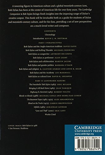 A towering figure in American culture and a global twentieth-century icon, Bob Dylan has been at the centre of American life for over forty years. The Cambridge Companion to Bob Dylan brings fresh insights into the imposing range of Dylan’s creative output. The first Part approaches Dylan’s output thematically, tracing the evolution of Dylan’s writing and his engagement with American popular music, religion, politics, fame, and his work as a songwriter and performer. Essays in Part II analyse his landmark albums to examine the consummate artistry of Dylan’s most accomplished studio releases. As a writer Dylan has courageously chronicled and interpreted many of the cultural upheavals in America since World War II. This book will be invaluable both as a guide for students of Dylan and twentieth-century culture, and for his fans, providing a set of new perspectives on a much-loved writer and composer.