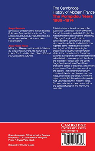 by Cambridge University Press (March 13, 2000) (Author) This is the most authoritative account available of the presidency of Georges Pompidou. Pompidou consolidated the constitutional changes made by de Gaulle, to the extent that he is now regarded as the Fifth Republic’s second founding father, and continued his haughty attitudes to foreign policy. He also launched a program of modernization and industrialization: under Pompidou France saw both the climax and the end of the postwar boom. Serge Berstein and Jean-Pierre Rioux analyze the politics of the period, and also give an overview of France’s economy, culture and society.