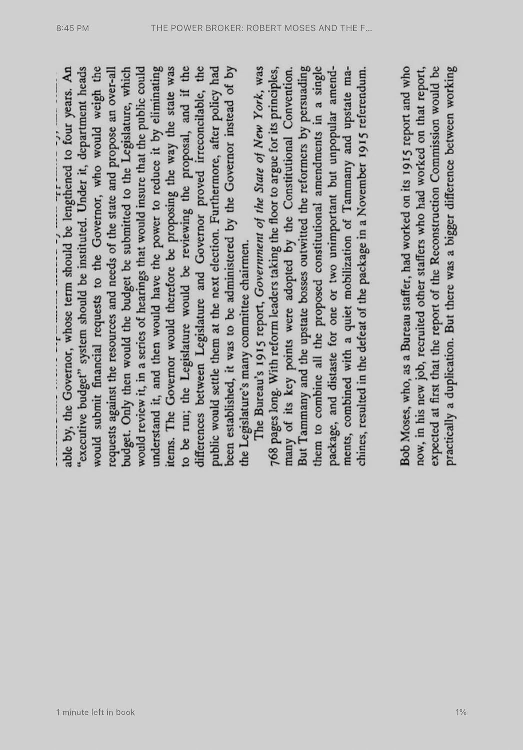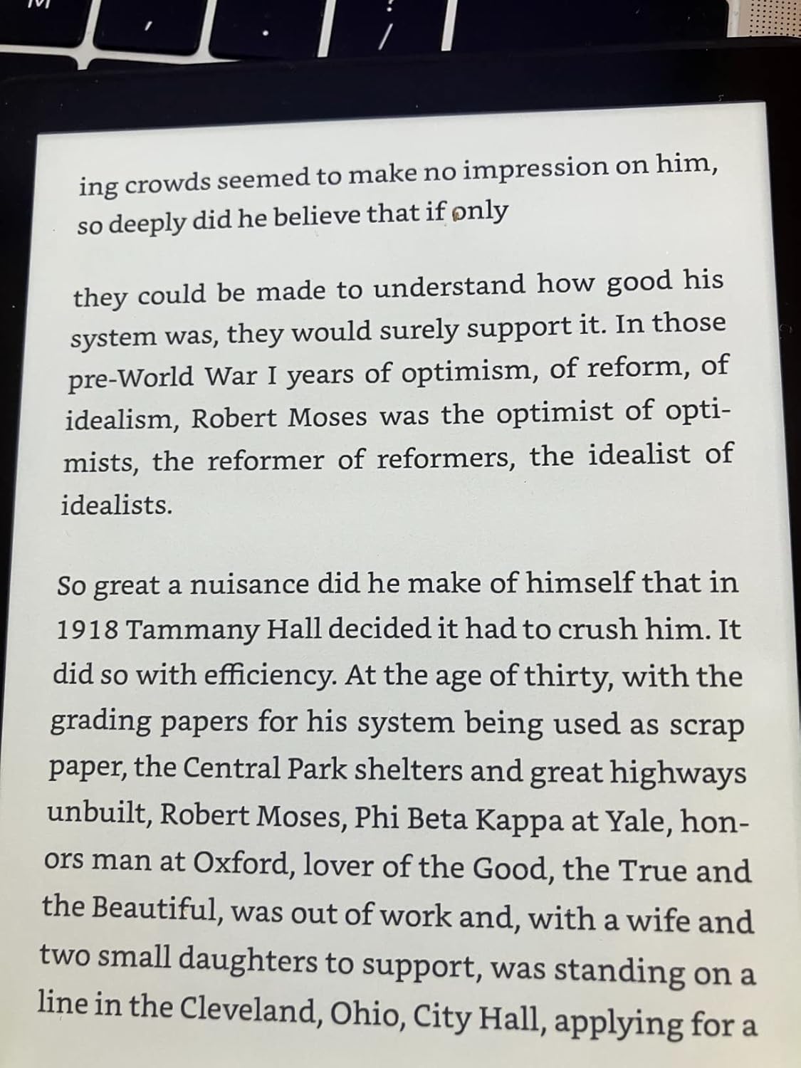 But The Power Broker is first and foremost a brilliant multidimensional portrait of a man—an extraordinary man who, denied power within the normal framework of the democratic process, stepped outside that framework to grasp power sufficient to shape a great city and to hold sway over the very texture of millions of lives. We see how Moses began: the handsome, intellectual young heir to the world of Our Crowd, an idealist. How, rebuffed by the entrenched political establishment, he fought for the power to accomplish his ideals. How he first created a miraculous flowering of parks and parkways, playlands and beaches—and then ultimately brought down on the city the smog-choked aridity of our urban landscape, the endless miles of (never sufficient) highway, the hopeless sprawl of Long Island, the massive failures of public housing, and countless other barriers to humane living. How, inevitably, the accumulation of power became an end in itself.