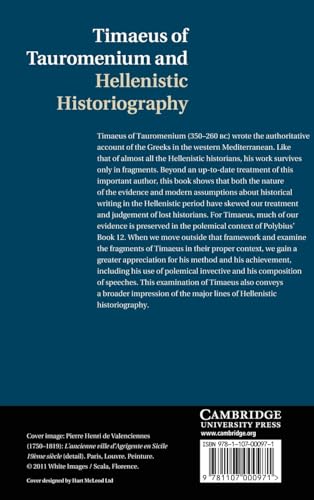 by Cambridge University Press; 1st edition (January 28, 2013) (Author) Timaeus of Tauromenium (350–260 BC) wrote the authoritative account of the Greeks in the Western Mediterranean. Like almost all the Hellenistic historians, his work survives only in fragments. Beyond an up-to-date treatment of this important author, this book shows that both the nature of the evidence and modern assumptions about historical writing in the Hellenistic period have skewed our treatment and judgement of lost historians. For Timaeus, much of our evidence is preserved in the polemical context of Polybius’ Book 12. When we move outside that framework and examine the fragments of Timaeus in their proper context, we gain a greater appreciation for his method and his achievement, including his use of polemical invective and his composition of speeches. This examination of Timaeus also conveys a broader impression of the major lines of Hellenistic historiography.
