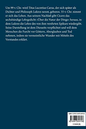 Lukrez: Über die Natur der Dinge Lesefreundlicher Großdruck in 16-pt-Schrift Großformat, 210 x 297 mm Berliner Ausgabe, 2019 Durchgesehener Neusatz mit einer Biographie des Autors bearbeitet und eingerichtet von Theodor Borken Entstanden vor 55 v. Chr. Das wahrscheinlich unvollendet gebliebene Werk wurde als Handschrift von Cicero herausgegeben. Erstdruck: Brescia o. J. (ca. 1473). Erste deutsche Übersetzung durch Franz Xaver Mayr unter dem Titel Von der Natur der Dinge, Wien 1784/85. Der Text folgt der Übertragung durch Hermann Diels, die 1924 (postum) von Johannes Mewaldt herausgegeben wurde. Ergänzungen von Diels zur Ausfüllung von Lücken in den überlieferten Handschriften sind in [ ] gesetzt, nicht ergänzbare Stellen durch *** bezeichnet. Textgrundlage ist die Ausgabe: Lukrez: Über die Natur der Dinge. Aus dem Lateinischen übersetzt von Hermann Diels, Berlin: Aufbau, 1957 (Philosophische Bücherei, Bd. 12). Umschlaggestaltung von Thomas Schultz-Overhage unter Verwendung des Bildes: Ricci, Marco: Römische Ruinen. Gesetzt aus der Minion Pro, 16 pt. Henricus Edition Deutsche Klassik UG (haftungsbeschränkt) Über den Autor: Um 99 v. Chr. wird Titus Lucretius Carus, der sich später als Dichter und Philosoph Lukrez nennt, geboren. 55 v. Chr. nimmt er sich das Leben. Aus seinem Nachlaß gibt Cicero das sechsbändige Lehrgedicht Über die Natur der Dinge heraus, in dem Lukrez die Lehre des von ihm verehrten Epikurs wiedergibt. Seine Darstellung ist dem Diesseits verpflichtet und will dem Menschen die Furcht vor Göttern, Aberglauben und Tod nehmen, indem sie vermeintliche Wunder mit Mitteln des Verstandes erklärt.